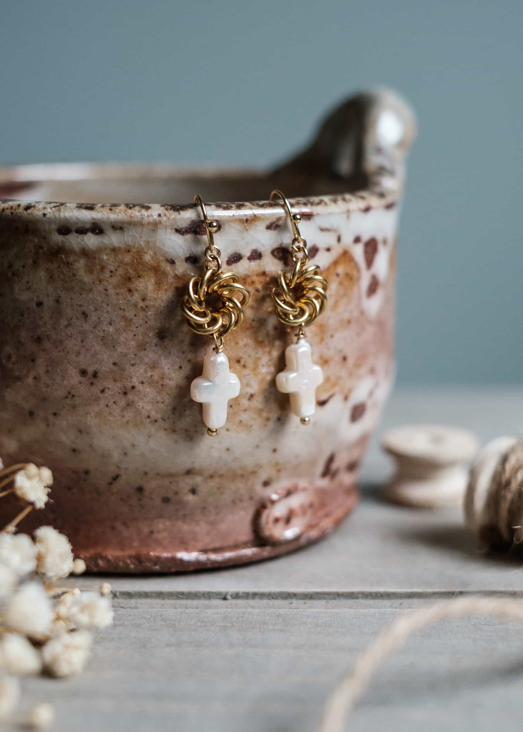 These natural freshwater pearl crosses hang from vintage brass swirl beads, adding a touch of romance and femininity.