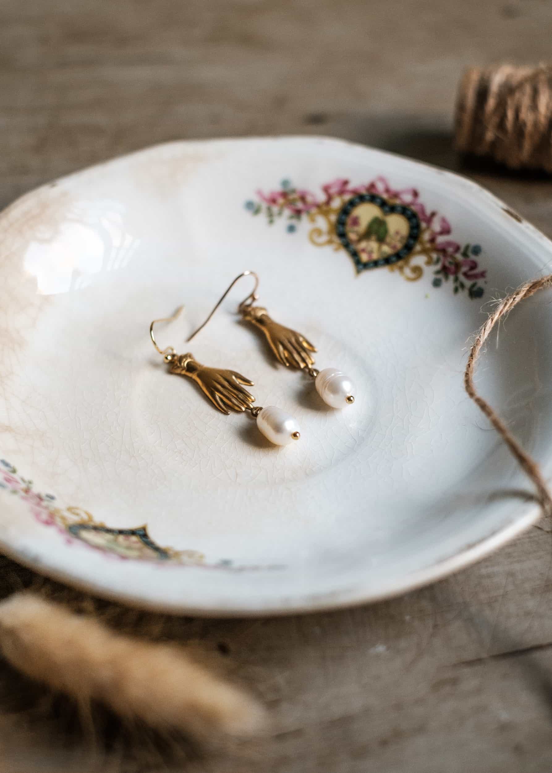 These whimsical brass hand earrings hold baroque white pearls, evoking the charm of a long-lost heirloom.