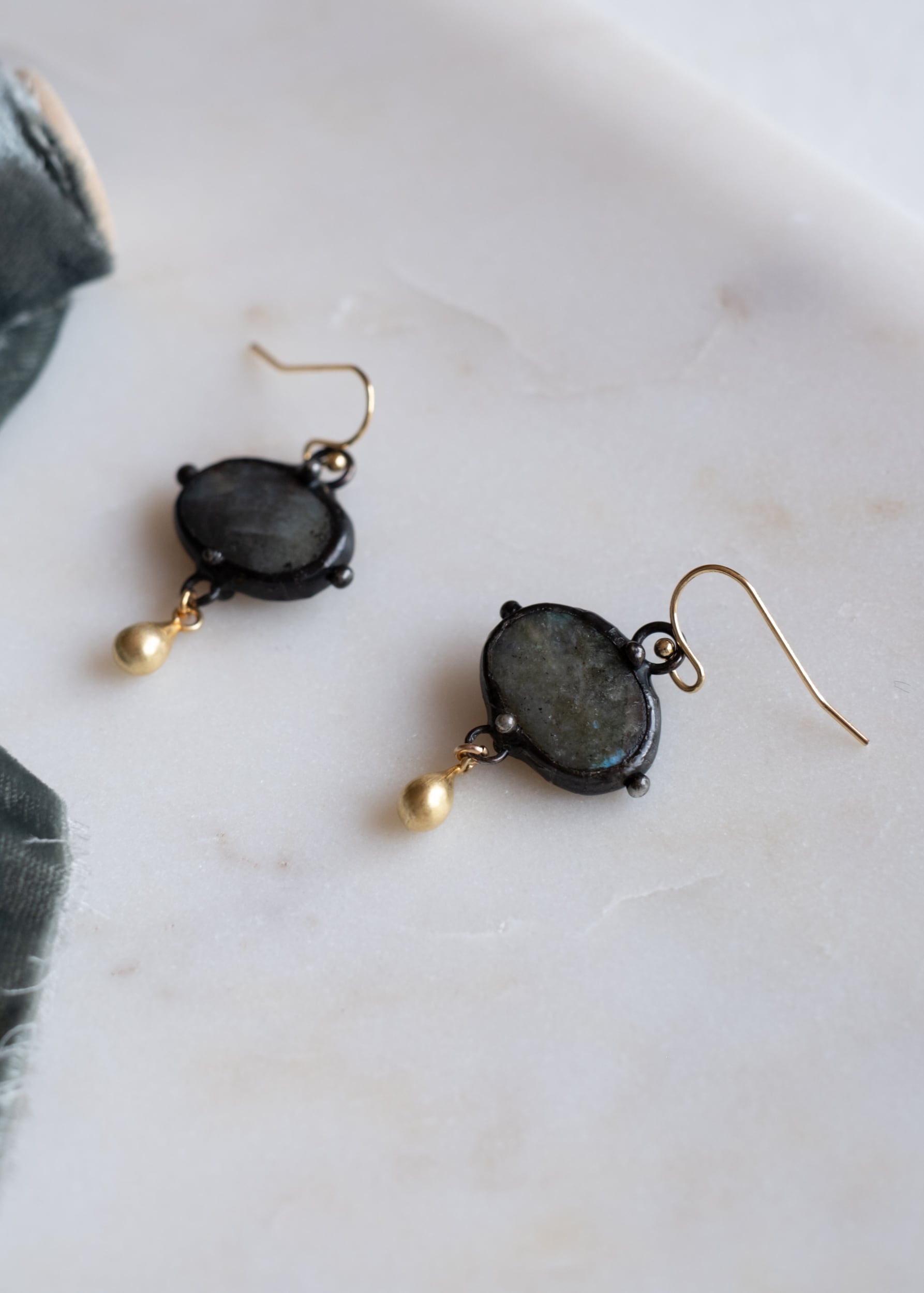 These earrings capture the quiet magic of labradorite, its dark body flashing with hidden blue fire. Suspended from each stone, a single golden teardrop adds a touch of warmth and contrast, balancing mystery with elegance.